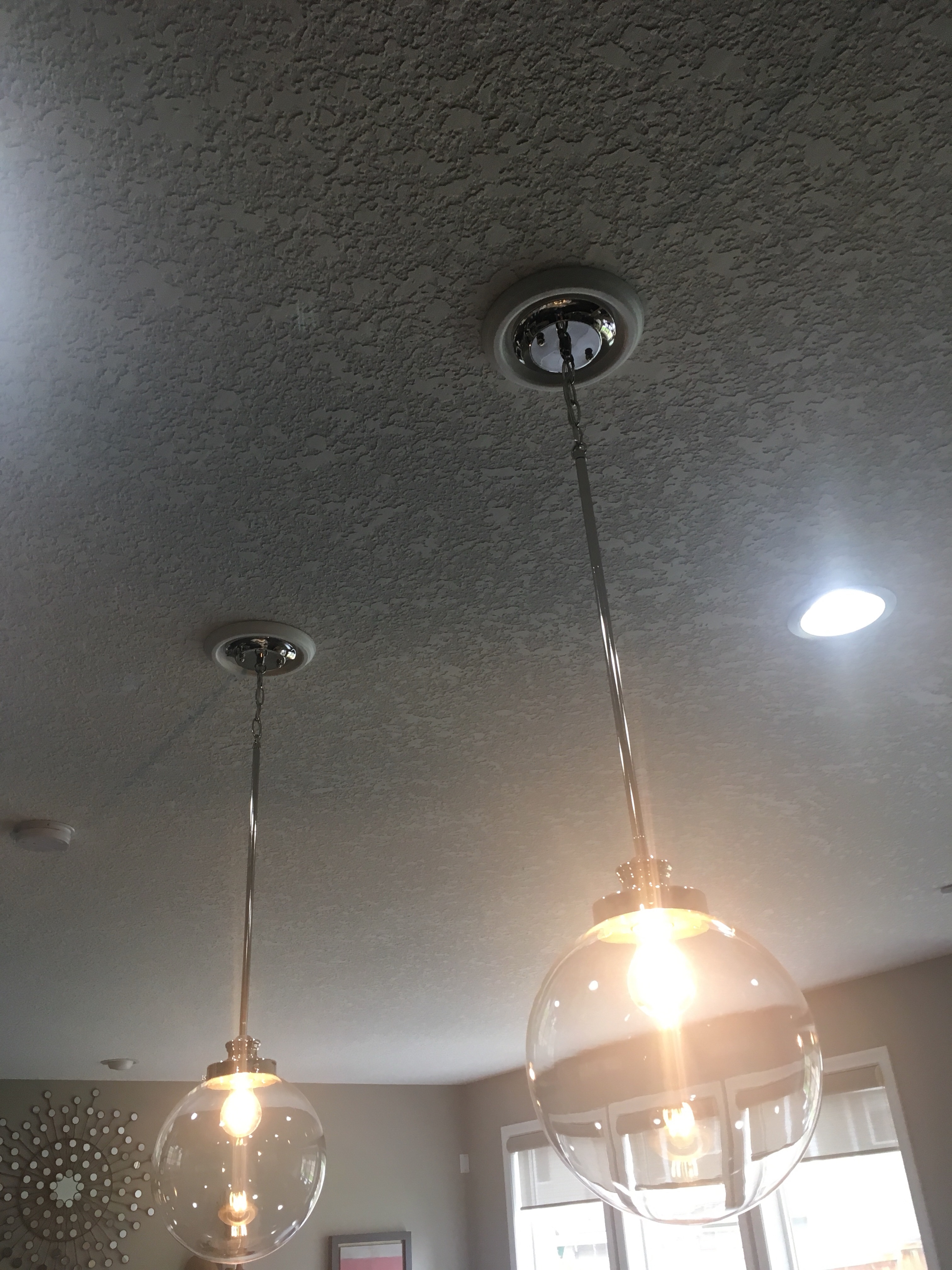 Today we helped a customer upgrade the look of her kitchen. She wanted pendant lights over the kitchen island but the builder installed 6″ pot lights instead. 8 years past and finally she’s getting what she wanted.